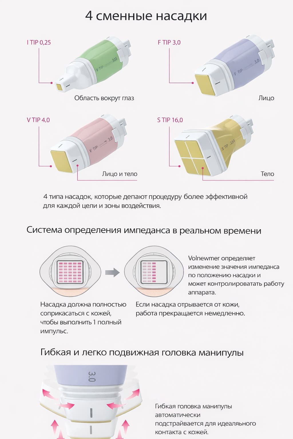 Аппарат рассчитан на работу в разных анатомических зонах благодаря 4 типам насадок: есть варианты для деликатных участков (например, области вокруг глаз), для контурирования лица, для общей подтяжки и для тела. Это позволяет врачу точнее подбирать протокол под задачу — от улучшения качества кожи до работы с локальной дряблостью.